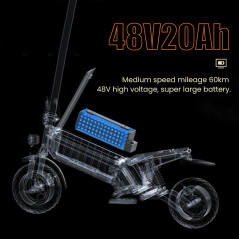 | Specifikace | Průměrná rychlost najetých kilometrů: 60 km Maximální rychlost: 60 km/h Rychlost: 15 km/h, 30 km/h, 60 km/h Motor: 1200W Baterie: 48 V 20 Ah Stoupání: 20° Doba nabíjení: 6-8h Pneu: 10 palců Brzda: Přední a zadní kotoučová brzda Nosnost: 120 kg |