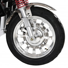| Spezifikation | Motor: 3000W Batterie: 72V 58Ah Höchstgeschwindigkeit: 45 km/h Reichweite: 86 km (ohne Aufladen) Bremssystem: Scheibenbremse vorne und Trommelbremse hinten Tragfähigkeit: 350 kg Vorderrad: 110/90-16 (110 mm Breite/90 Höhe/Breite-Verhältnis – 16 Zoll Durchmesser) Hinterrad: 4,5 Zoll breit – 12 Zoll Durchmesser Scheinwerfer: LED 1,3 W Lumen Ladezeit: 6-8h |