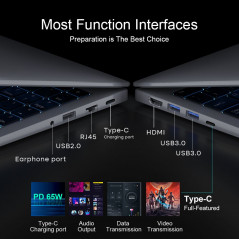 Επωφεληθείτε από τις θύρες Dual Type-C, USB 3.0/2.0, HDMI, WiFi 6 και RJ45 για γρήγορη μεταφορά δεδομένων, αποτελεσματική φόρτιση και συνδεσιμότητα πολλαπλών οθονών.