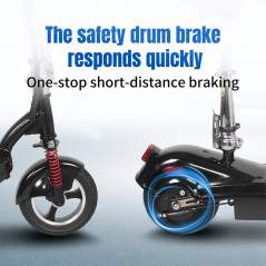 Equipado con neumáticos macizos que no requieren mantenimiento, este scooter ofrece un excelente agarre y estabilidad para viajes suaves y seguros.Los frenos de tambor brindan un frenado suave y receptivo, garantizando su seguridad en todo momento.