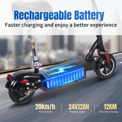 Impulsado por un motor de CC de 350 W, este scooter eléctrico ofrece una potencia constante y silenciosa.Con una velocidad máxima de 20 km/h, se adapta perfectamente a la vida urbana.