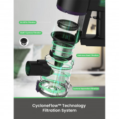 Le V8 Pro est équipé du système de filtration CycloneFlow en 4 étapes, assurant que 99,97 % des particules de poussière microscopiques, aussi petites que 0,1 micron, sont retenues. Cela garantit un air frais pendant l'aspiration et prévient toute pollution secondaire de l'air. Son bac à poussière de 500 ml réduit la fréquence des vidanges pour un nettoyage continu.