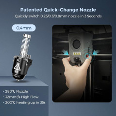 Desfrute de uma velocidade de impressão padrão de 300 mm/s e uma velocidade máxima de extrusão de 600 mm/s.Graças ao seu bico eficiente, ao seu rápido aquecimento em 35 segundos a 200 graus Celsius e à sua potência de aquecimento de 50 W, você reduzirá consideravelmente os tempos de espera.